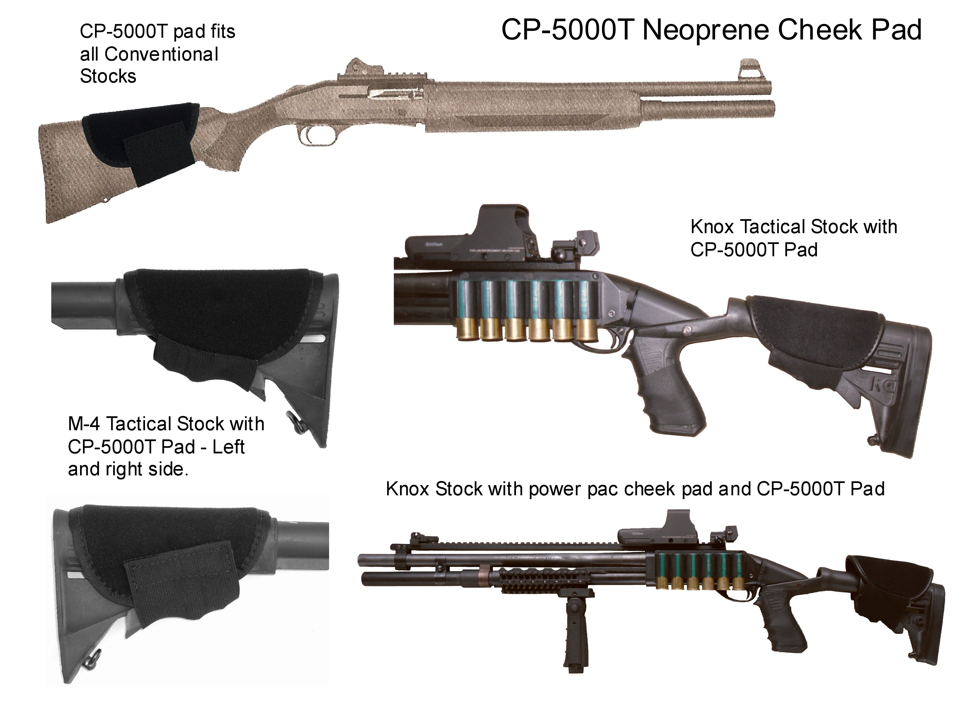 This is our CP-5000 neoprene Cheek Pad. This was designed to add 1/4" to the height of classic shotguns which were made with lower comb heights back then. It still comes in handy on modern rifles and shotguns for shooters needing just a little more height or looking for some recoil cushioning. Easy on and off application with an adjustable 3" elastic strap.